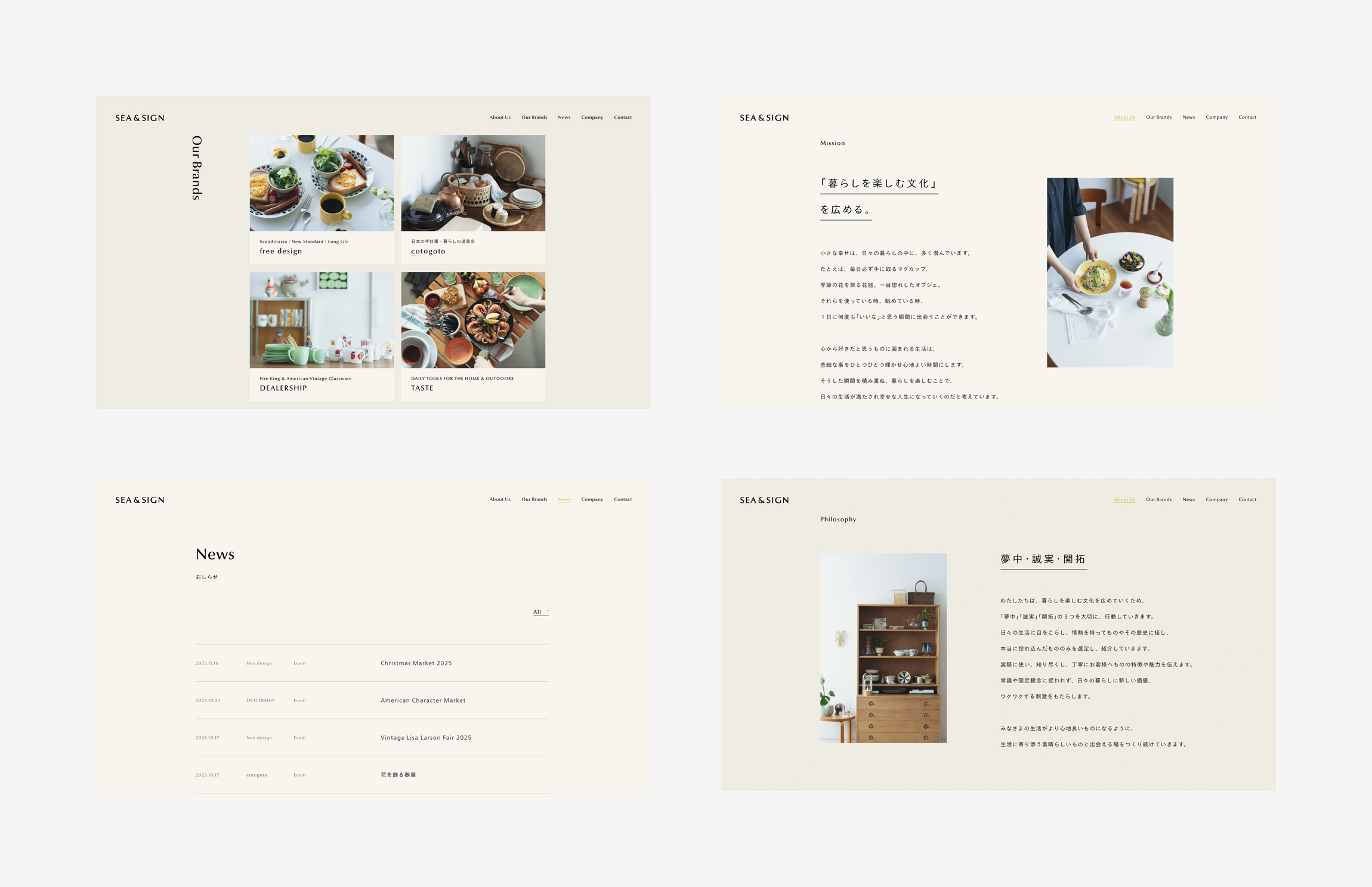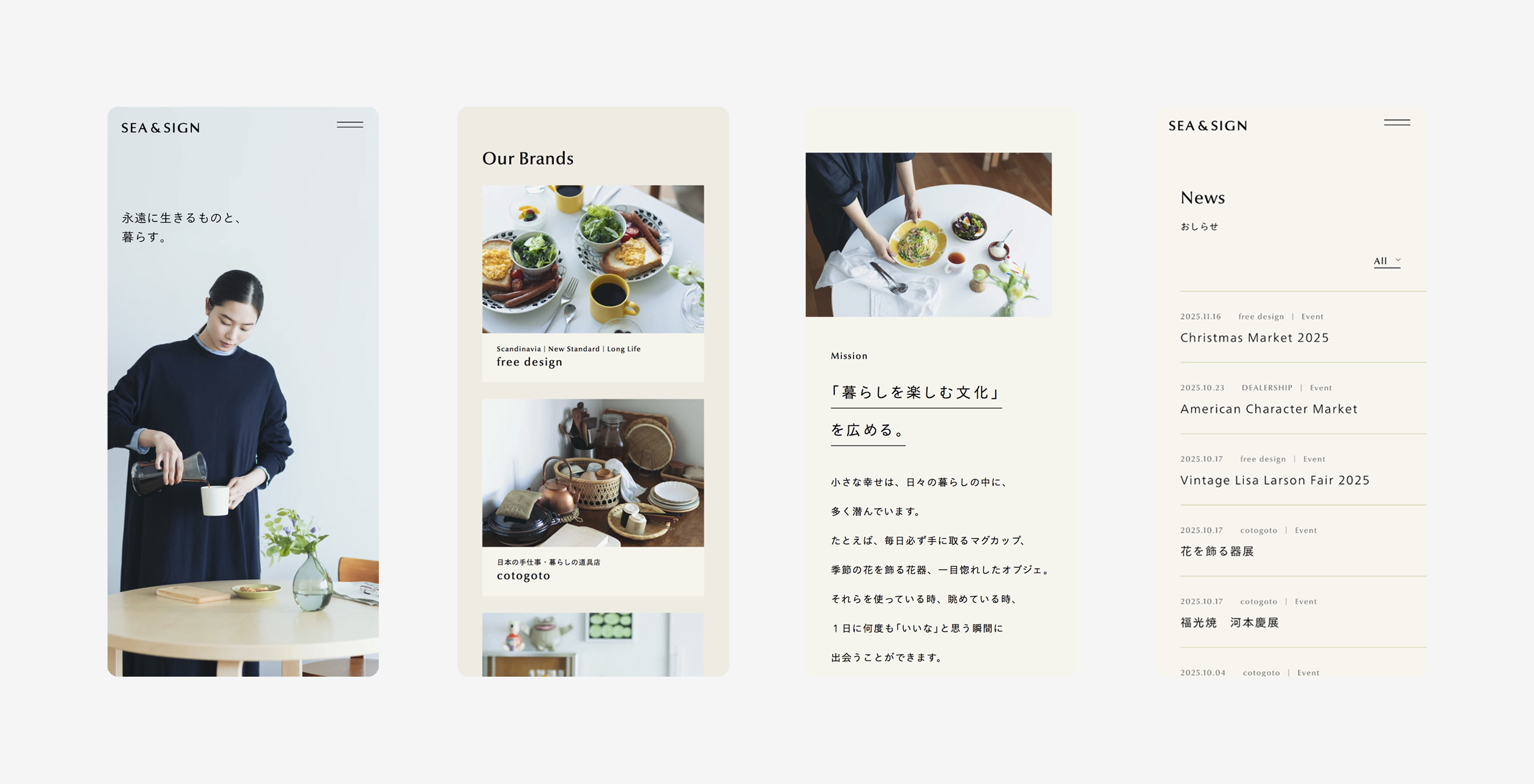 北欧雑貨、アメリカンヴィンテージ、日本の手仕事、暮らしの道具などそれぞれの専門店を運営している株式会社シーアンドサインのリブランディングに伴い、ブランドアイデンティティ・ロゴデザイン・ビジュアルディレクション・ウェブデザインを担当いたしました。